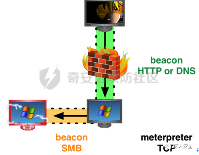 SMB Beacon使用命名管道与父级Beacon进行通讯,当两个Beacons链接后,子Beacon从父Beacon获取到任务并发送。因为链接的Beacons使用Windows命名管道进行通信,此流量封装在SMB协议中,所以SMB Beacon相对隐蔽,常用来绕防火墙有奇效。