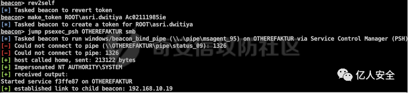 建立好SMB Beacon监听,尝试进行横向,利用明文密码或者hash让机器上线SMB Beacon,这里利用的是psexec_psh