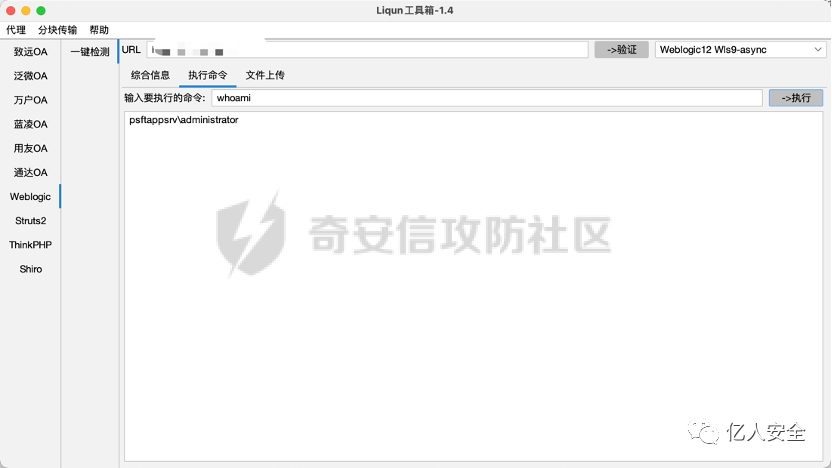 Weblogic12存在 Wls9-async漏洞和 XMLDecoder漏洞,这里直接利用漏洞利用工具验证,漏洞存在。