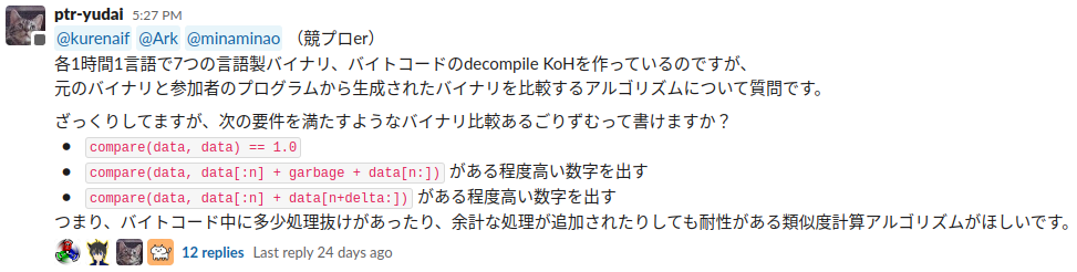 この問題を作るにあたってもっとも重要なのがバイナリ比較アルゴリズムです。 一般にバイナリは巨大なので、高速かつ良い精度で差分が求められるアルゴリズムが必要になりました。