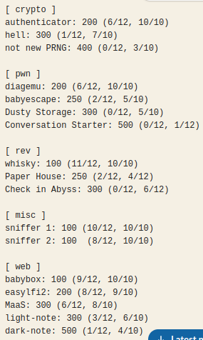 前日までスコア送信などのテストができなかったため、KoHの作問者側もインフラ側もスコアの送受信にいくらかトラブルがありました。 結果として最後までスコアボードが正しい結果を表示できず、参加者に不便を強いてしまったのが心残りです。
