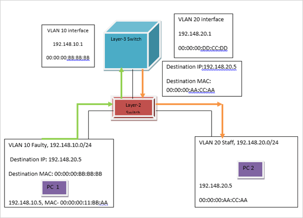下图显示了三层交换机与二层交换机相结合的跨 VLAN 路由操作。在大学中,教职员工和学生的 PC 通过二层和三层交换机连接在不同的VLAN上。