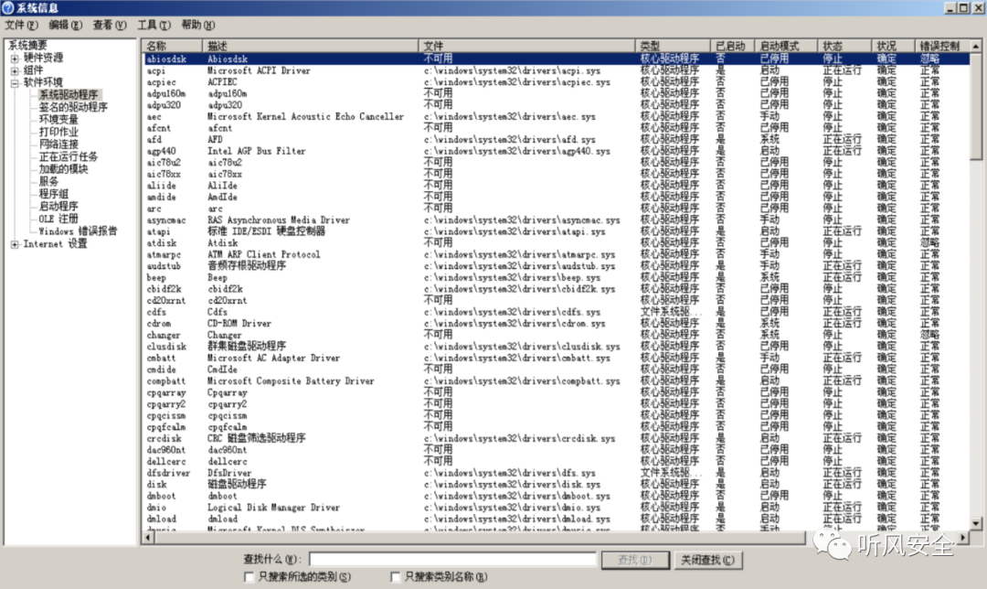 在【系统信息】窗口中,单击【软件环境】中的【系统驱动程序】选项,可以查看系统驱动程序的名称、描述、文件等信息。