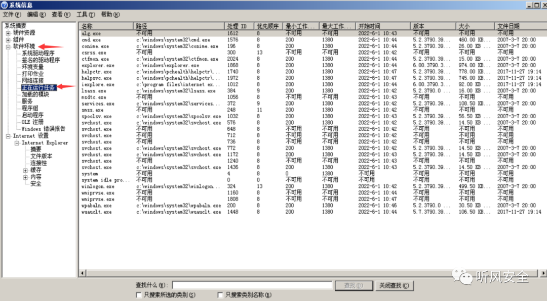 在【系统信息】窗口中,单击【软件环境】中的【正在运行任务】选项,可以查看正在运行任务的名称、状态、路径