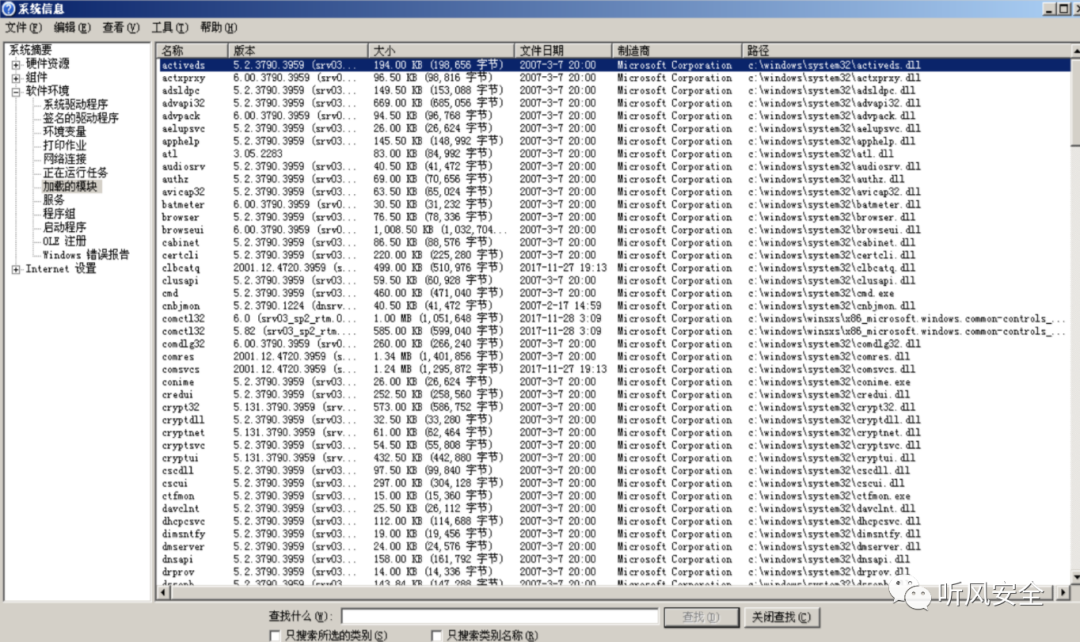 在【系统信息】窗口中,单击【软件环境】中的【加载的模块】选项,可以查看加载的模块名称、路径等信息。