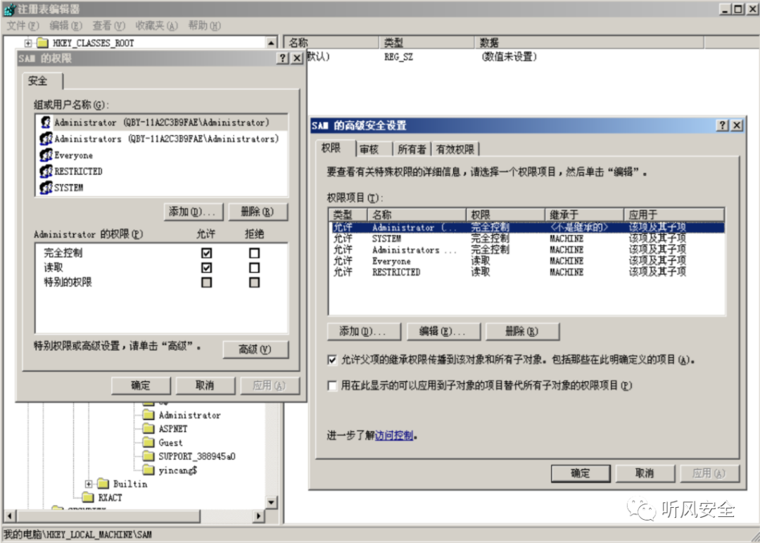 选择【HKEY_LOCAL_MACHINE】下的【SAM】选项,右键点击权限界面并进入高级安全设置,更改权限然后才能看到东西,不然啥也看不到。