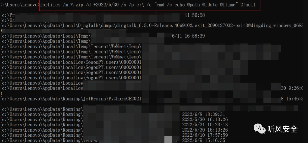forfiles /m *.zip /d +2022/5/30 /s /p c:\ /c "cmd /c echo @path @fdate @ftime" 2>null
