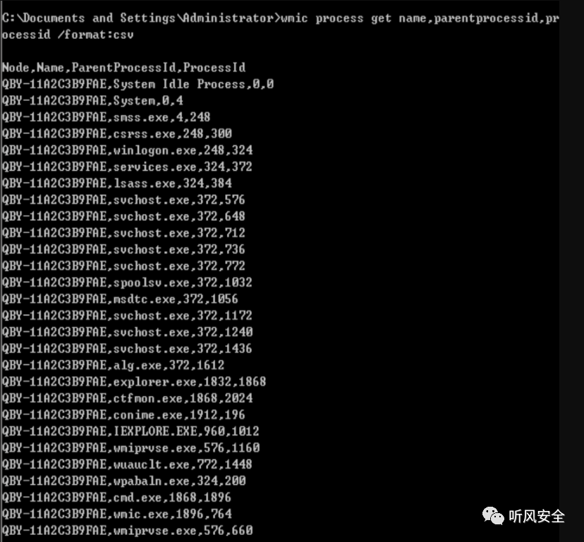 wmic process get name,parentprocessid,processid /format:csv 这样看起来就简洁一点