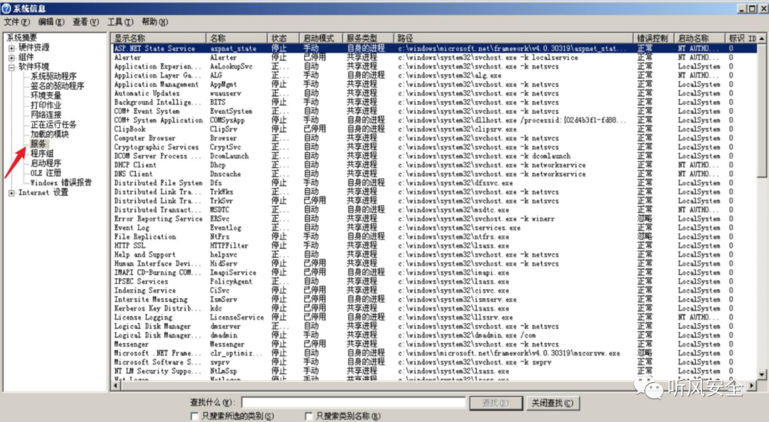 在【系统信息】窗口中,单击【软件环境】中的【服务】选项,可以查看服务的名称、状态、路径等信息。