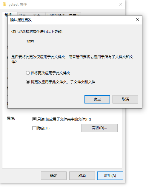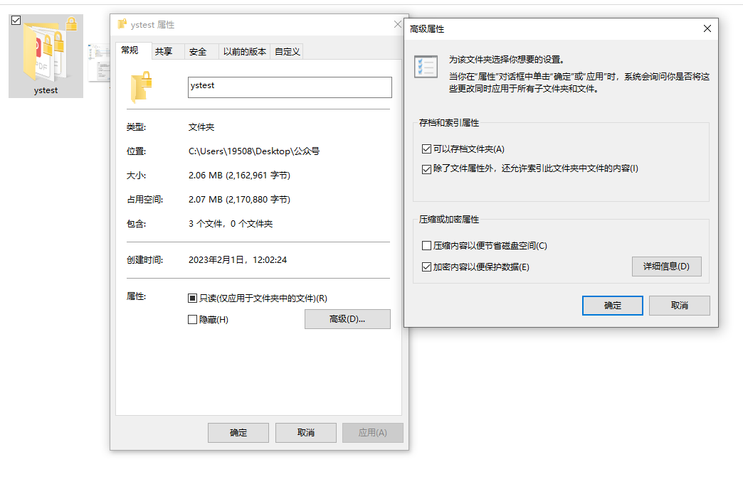 Windows操作系统中,EFS加密操作十分简单,选中文件或文件夹右击选择“属性”-点击“高级”,在弹出的对话框中将“加密内容以便保护数据”复选框中勾选,点击“确定”。中间会提示子文件加的处理方法,选择默认即可,再点击“确定”即可完成加密。加密对象就会显示锁头标志,说明加密成功。