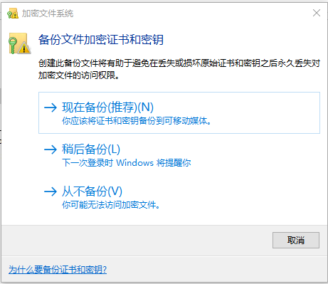 若为首次EFS加密,右下角通知栏会弹出“备份文件加密证书和密钥”提示。