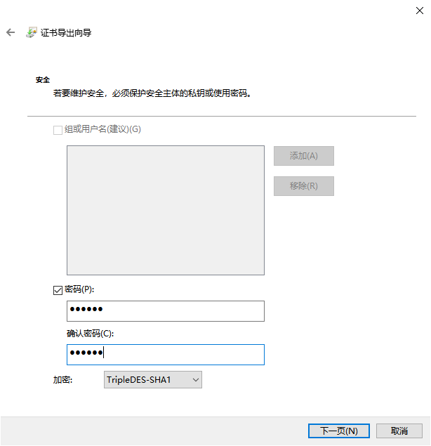 5、选择“密码”,输入两次相同的密码(这个密码将在恢复导入的时候使用),点击“下一步”;