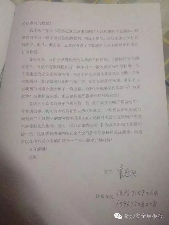 故事要从一位父亲写给第四届网络安全大会的信说起,这位父亲在信中提到自己的儿子向Wooyun提交了世纪佳缘的一个SQL注入漏洞,因为测试注入跑了4000条用户的信息,导致被儿子抓,这位父亲表示不能理解为啥自己的儿子会被查水表。