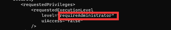 requireAdministrator:需要以管理员权限来运行,此类应用程序图标右下方会有个盾牌标记