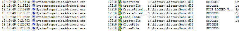 这里我们先用第一种方法来进行实验,实验对象是C:\Windows\SysWOW64\SystemPropertiesAdvanced.exe和Listary。Listary是一个很好用的检索小工具,我通过processmonitor,设置好过滤条件,查看SystemPropertiesAdvanced.exe调用的dll时发现它会调用一个Listary下的一个名为ListaryHook.dll的dll。