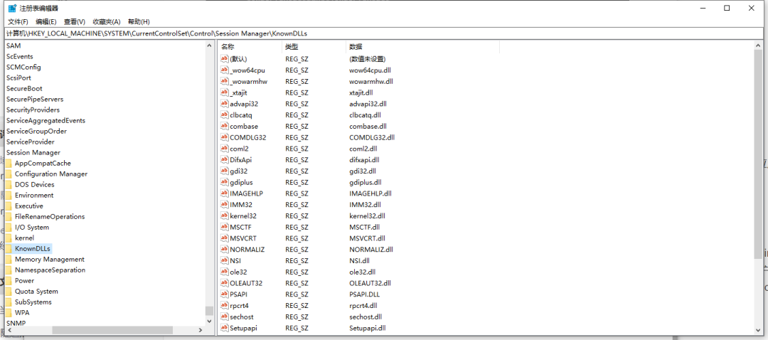 SYSTEM32目录SYSTEM目录Windows目录SetCurrentDirecctory)PATH环境变量中列出的目录Know DLLs注册表项的机制:Know DLLs注册表项指定的DLL是已经被操作系统加载过后的DLL,不会被应用程序搜索并加载。在注册表HKEY_LOCAL_MACHINE\SYSTEM\CurrentControlSet\Control\Session Manager\KnownDLLS处可以看见这些dll在knowdlls表项中的dll是预先就加载进内存空间的,被诸多应用调用着,改动需要高权限。