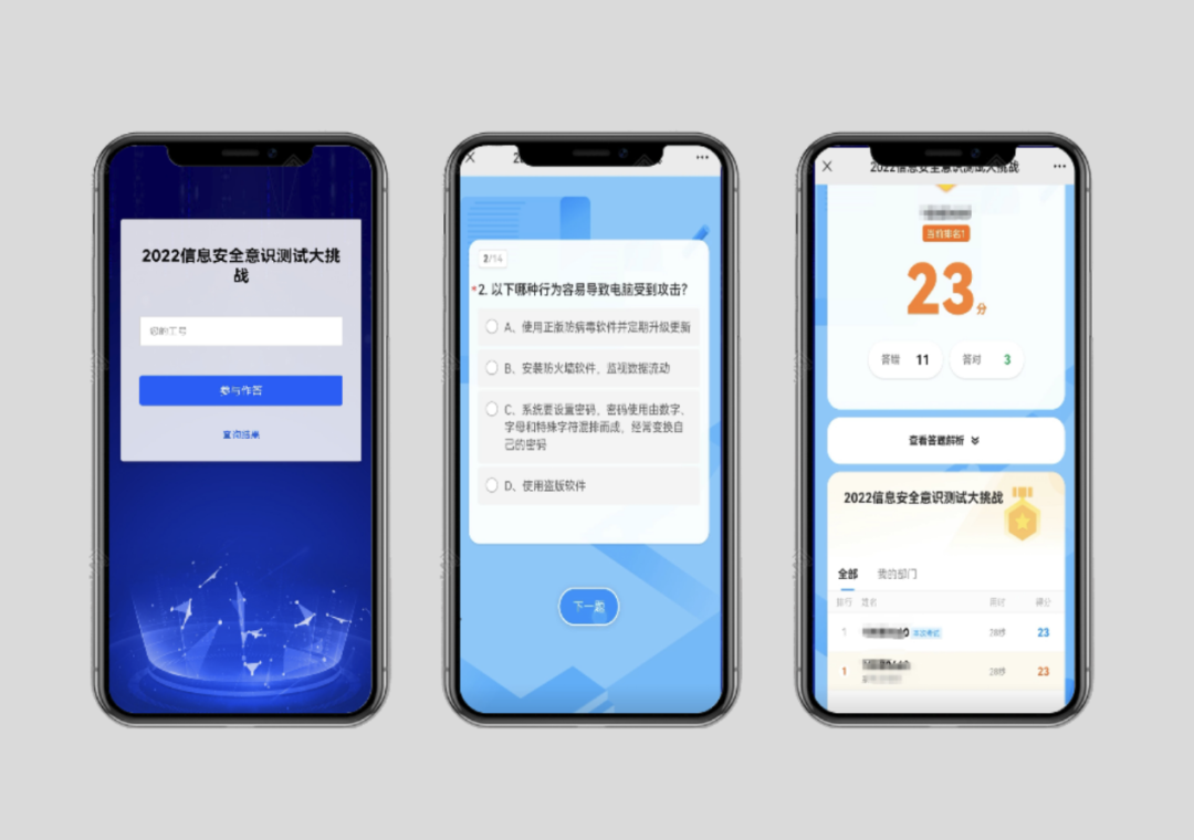 通过互动答题形式,进行网络安全意识、知识、技能的测评,根据测评结果可以对个人或部门进行安全情况分析,对日后网络安全工作开展打下坚实的基础。