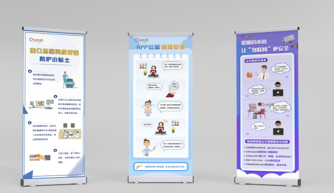 无论是网络安全宣传活动,还是在日常网安知识宣教,易拉宝都是一种不可或缺的宣传手段。易拉宝可读性强,呈现形式直观,传播效果好,能够让受众群清晰明了地获取相关知识。