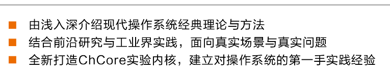 本书的另一个重要特色是试图为操作系统的教学与人才培养提供完整的配套体系:在教材之外,作者提供了课程课件、授课视频、课程作业等丰富的教辅材料。作者所在的上海交通大学并行与分布式系统研究所还设计与实现了一个面向教学与科研的微内核架构操作系统ChCore,并提供了一整套课程实验与相应的测试用例,以帮助读者从头实现一个可以运行在ARM开发板上的操作系统。