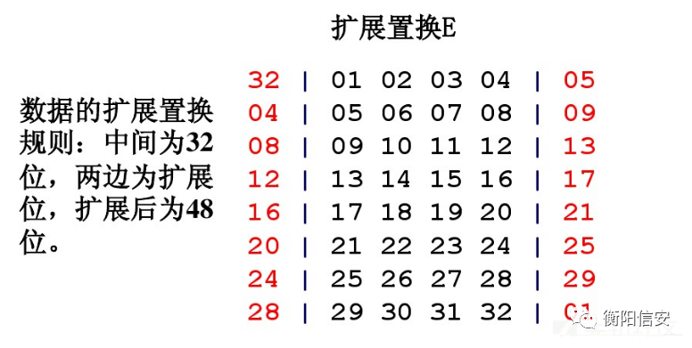 函数f由四步运算构成:子密钥生成、扩展置换、S盒代替、P盒置换通过扩展置换E,数据的右半部分Rn从32位扩展到48位。扩展置换改变了位的次序,重复了某些位。a、产生与秘钥相同长度的数据以进行异或运算,R0是32位,子秘钥是48位,所以R0要先进行扩展置换之后与子秘钥进行异或运算;b、提供更长的结果,使得在替代运算时能够进行压缩。Rn扩展置换之后与子秘钥Kn异或以后的结果作为输入块进行S盒代替运算,功能是把48位数据变为32位数据。代替运算由8个不同的代替盒(S盒)完成。每个S盒有6位输入,4位输出。所以48位的输入块被分成8个6位的分组,每一个分组对应一个S盒代替操作。经过S-盒代替,形成8个4位分组结果。==注意:每一个S盒的输入数据是6位,输出数据是4位,但是每个S-盒自身是64位!!==8个S-盒的值如下图(从上到下依次为S1-S8):