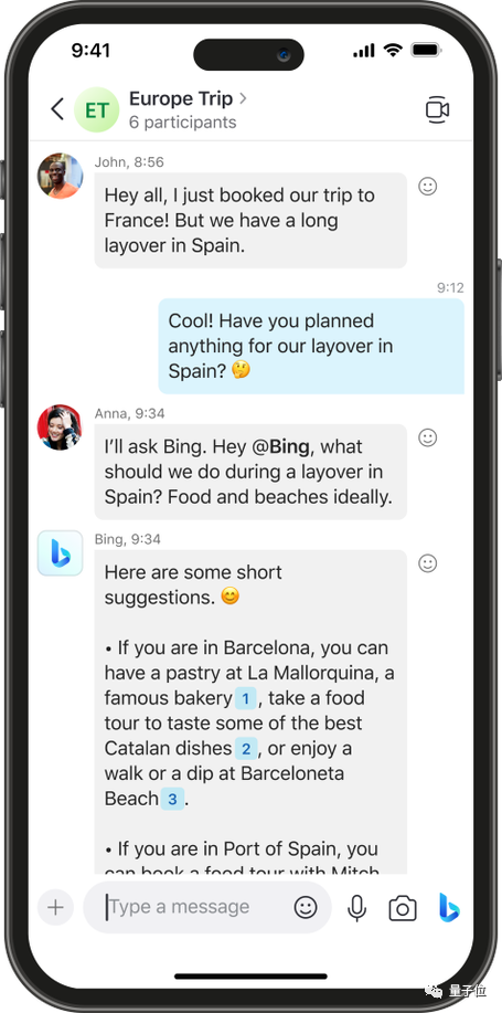 比如你正在和你老妈聊天,聊到旅游时有不知道的问题就可以在你们的对话中直接@Bing,让它给出一些建议(也可以语音召唤)。![]()