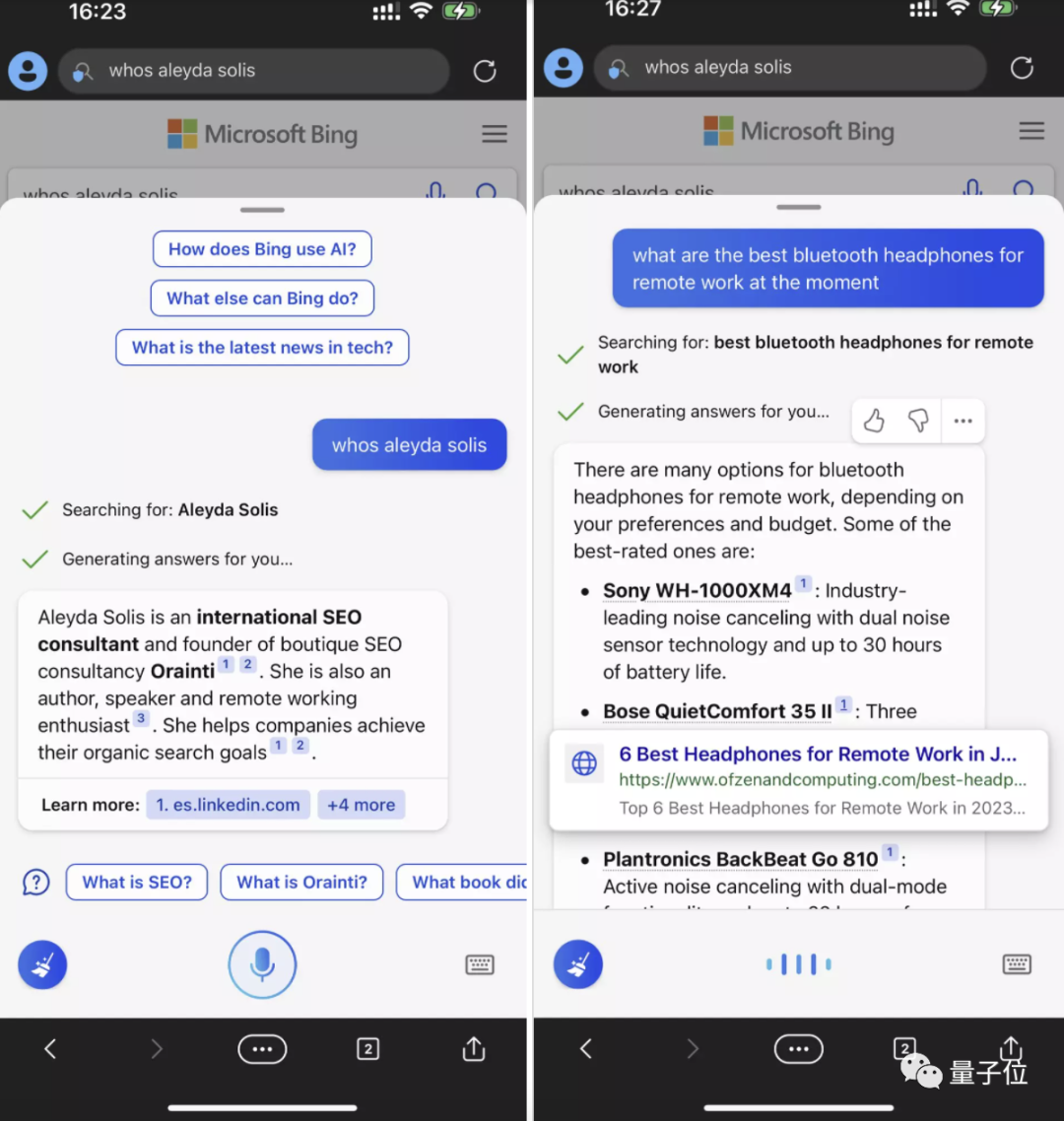 早在上周二,他们就对外透露会在未来几周内推出这一版本。Ps. 手机版距离桌面版新Bing正式上线(2月7日)只不过才两周多的时间,再次感叹:微软是真的拿出了分秒必争的架势啊。通过点击界面底部的Bing图标即可启用聊天会话,效果与桌面端没有区别:随便提一个或简单或复杂问题,就能获得ChatGPT给出的答案,以及相关引用链接。也可以选择答案呈现的方式——只列要点或者给出完整文本等。通过进一步聊天的方式,还可以优化它给出的答案,或者帮你撰写符合你要求的电子邮件、诗歌、小说等。微软提到,试用阶段开启后,用户反馈中呼声最高的几个功能中就包括语音输入。这次,就安排上了。当你通过口述提问Bing,Bing也会用语音回答你,就像Siri一样。默认女声,但发声还是蛮像机器人的。![]()