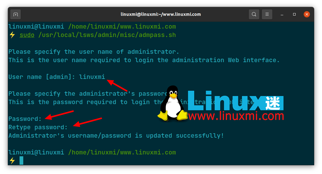 如果您在未选择新用户名的情况下点击“Enter”,则默认将 admin 作为新的管理用户名(本文示例为:linuxmi)。密码跟在用户名输入之后。因此,重新输入密码并点击“Enter”。