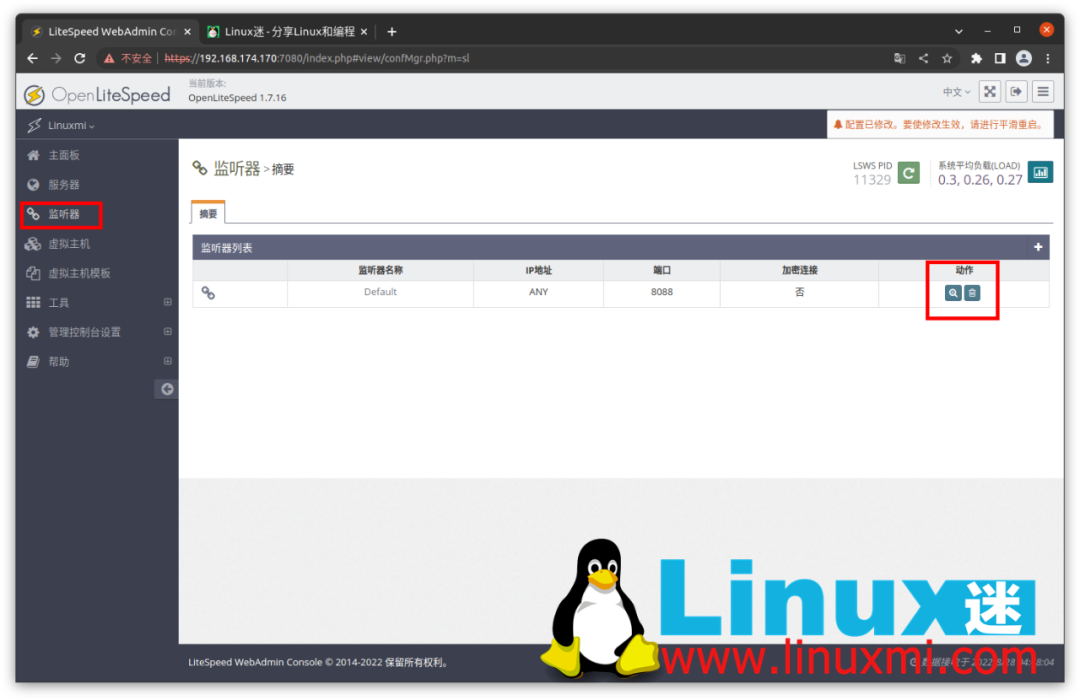 默认情况下,OpenLiteSpeed 侦听端口 8088。但是,我们可以将其更改为端口 80,即 HTTP 请求的默认端口。