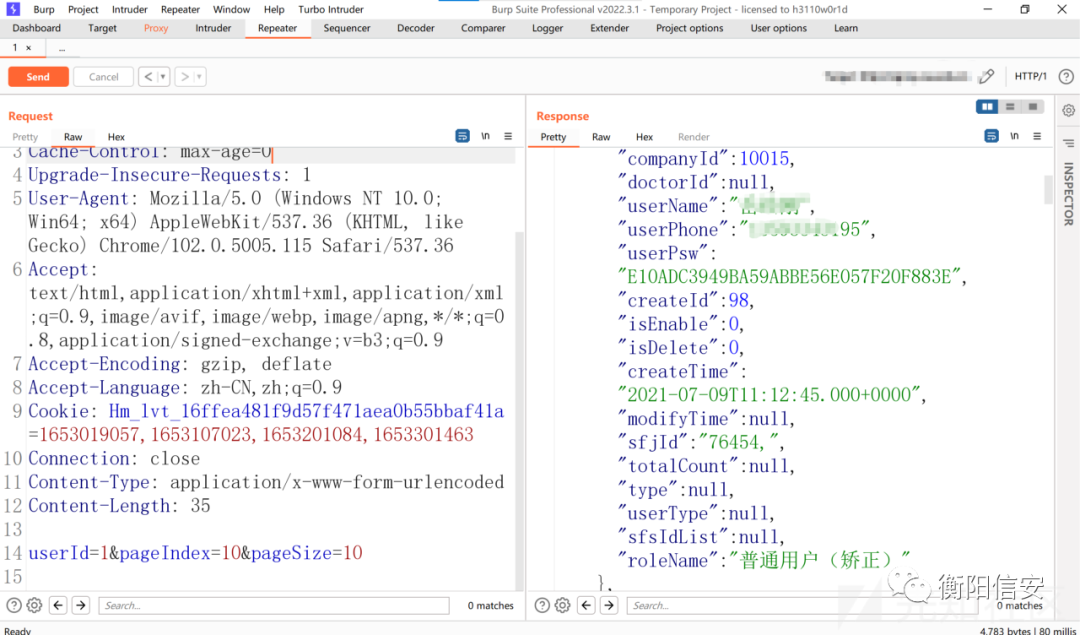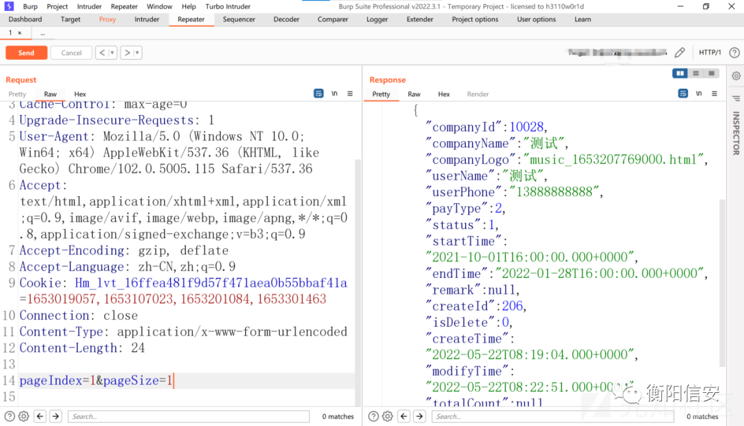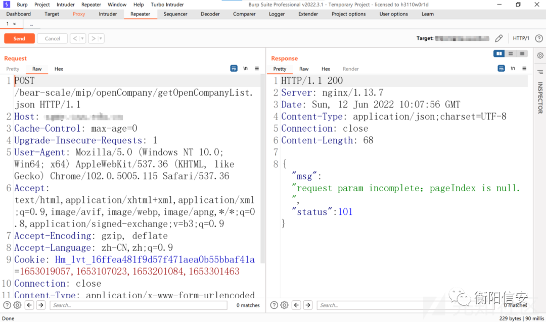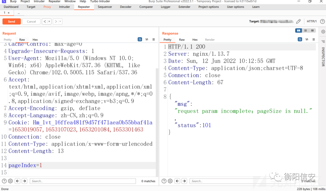 看到回显的返回包,我心中窃喜,大概率是有戏的,这里提示我们的是请求参数缺失,pageIndex参数为空,那么我们可以直接构造一个pageIndex参数传过去看看
