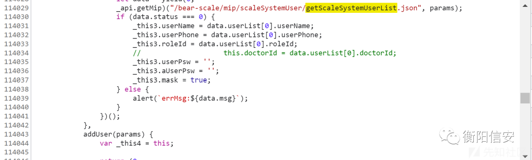 这里成功的返回了数据,返回了一个测试的账号,那么此时我们就有了账号了,可以对该测试账号进行爆破,但我想的是,既然一个接口出现了未授权,那很大概率这个系统的所有接口基本上也都是未授权,接下来,我继续从JS里面寻找接口,找到了一个/bear-scale/mip/scaleSystemUser/getScaleSystemUserList.json 的接口,按照之前的方法构造参数请求