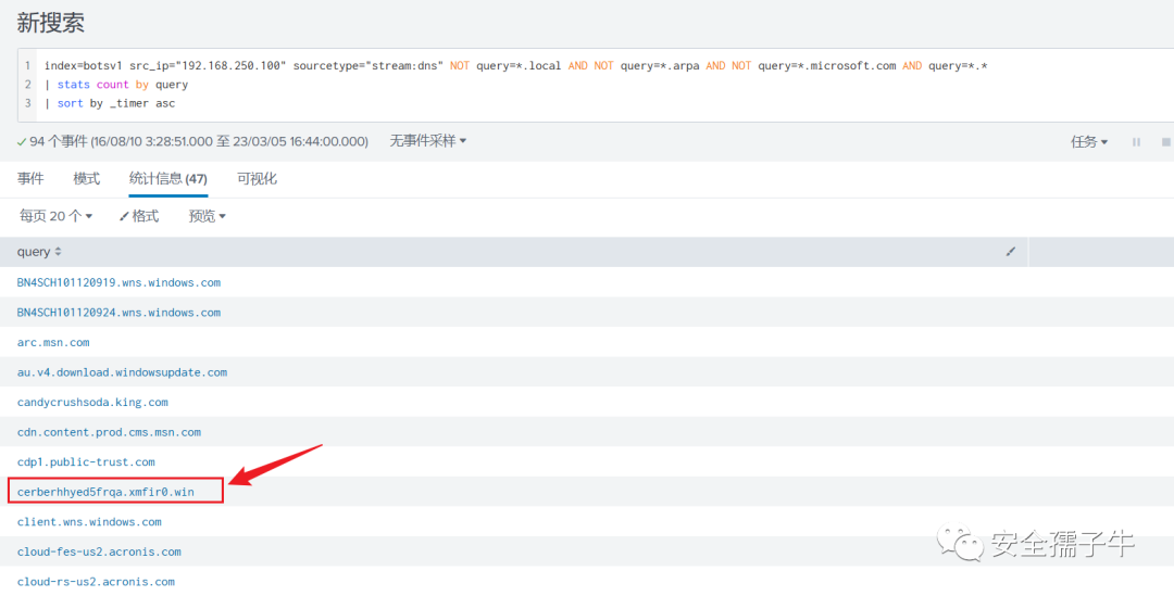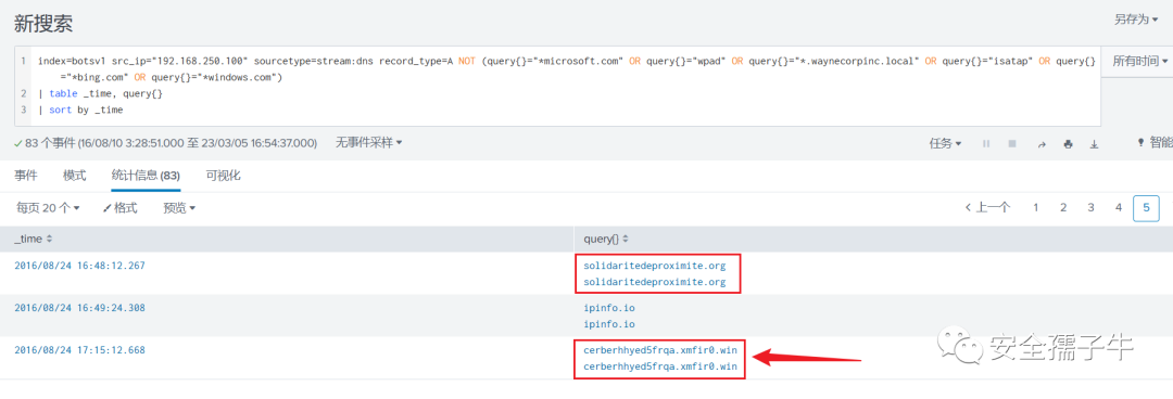 index=botsv1 src_ip="192.168.250.100" sourcetype=stream:dns record_type=A NOT (query{}="*microsoft.com" OR query{}="wpad" OR query{}="*.waynecorpinc.local" OR query{}="isatap" OR query{}="*bing.com" OR query{}="*windows.com")