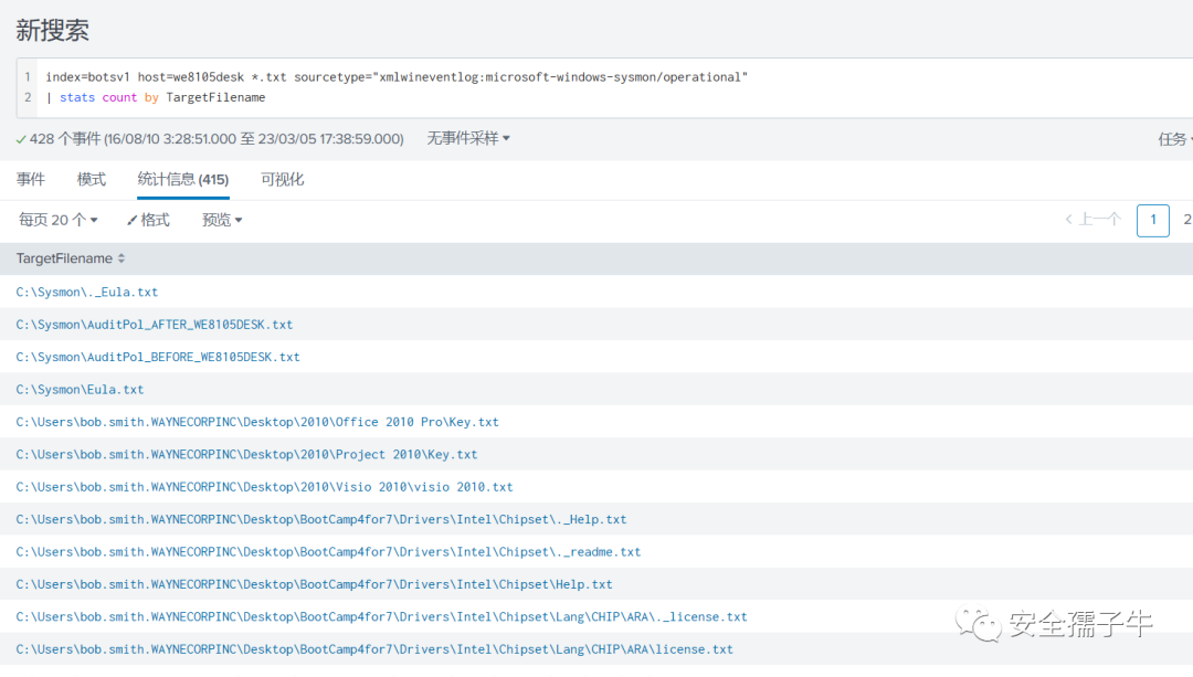 index=botsv1 host=we8105desk sourcetype="XmlWinEventLog:Microsoft-Windows-Sysmon/Operational" TargetFilename="C:\\Users\\bob.smith.WAYNECORPINC\\*.txt"