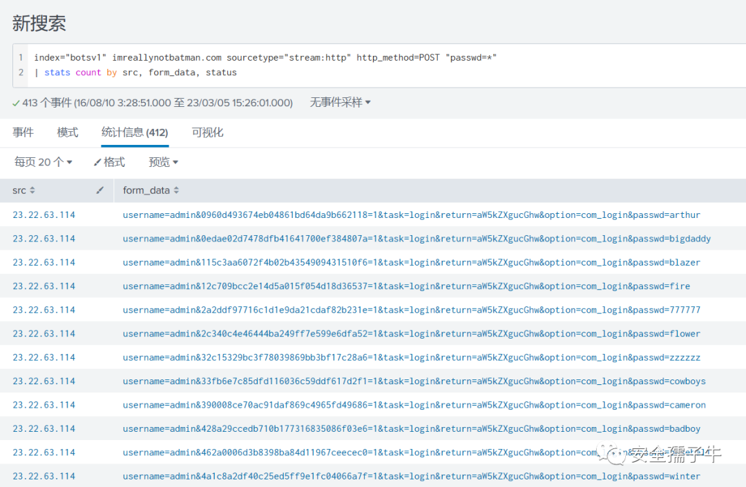 index="botsv1" sourcetype="stream:http" http_method="POST" form_data=*username*passwd*