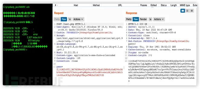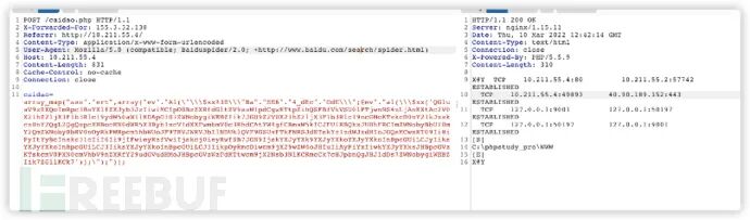 请求体中传递的payload为base64编码,并且存在固定的QGluaV9zZXQoImRpc3BsYXlfZXJyb3JzIiwiMCIpO0BzZXRfdGltZV9saW1pdCgwKTtpZihQSFBfVkVSU0lPTjwnNS4zLjAnKXtAc2V0X21hZ2ljX3F1b3Rlc19ydW50aW1lKDApO307ZWNobygiWEBZIik7J