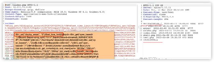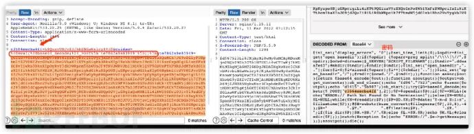 每个请求体都存在@ini_set(“display_errors”, “0”);@set_time_limit(0)开头。并且存在base64等字符