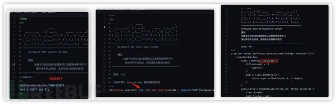 https://github.com/AntSwordProject/AwesomeScript蚁剑官方为我们提供了制作好的后门,官方的脚本均做了不同程度“变异”,蚁剑的核心代码是由菜刀修改而来的,所有普通的一句话木马也可以使用。