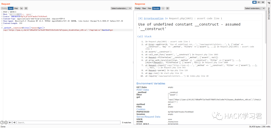 写入so文件到tmp目录,用夏老师的文件传输平台(pan.xj.hk)将so文件上传到平台,然后在thinkphp中用copy函数将文件传输平台的so文件下载到tmp目录。修改bypass php文件,让php可以执行反弹shell。