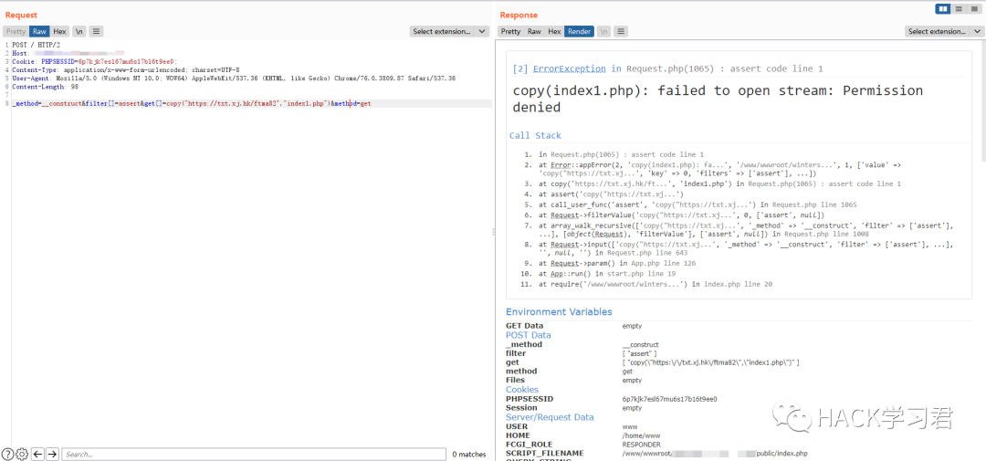 难道网站不是thinkphp二开的?不可能啊,这个时候就需要看burp的返回结果来判断了,将getshell工具的流量代理到burp,查看返回结果判断是否为thinkphp,Proxifier将getshell工具加入到规则中,burp的render中返回结果证实我的判断,网站的确是thinkphp,版本是5.0.20,存在rce漏洞,但是网站路径无法写入shell文件,权限不够。