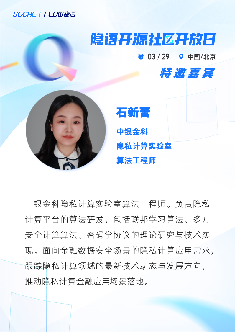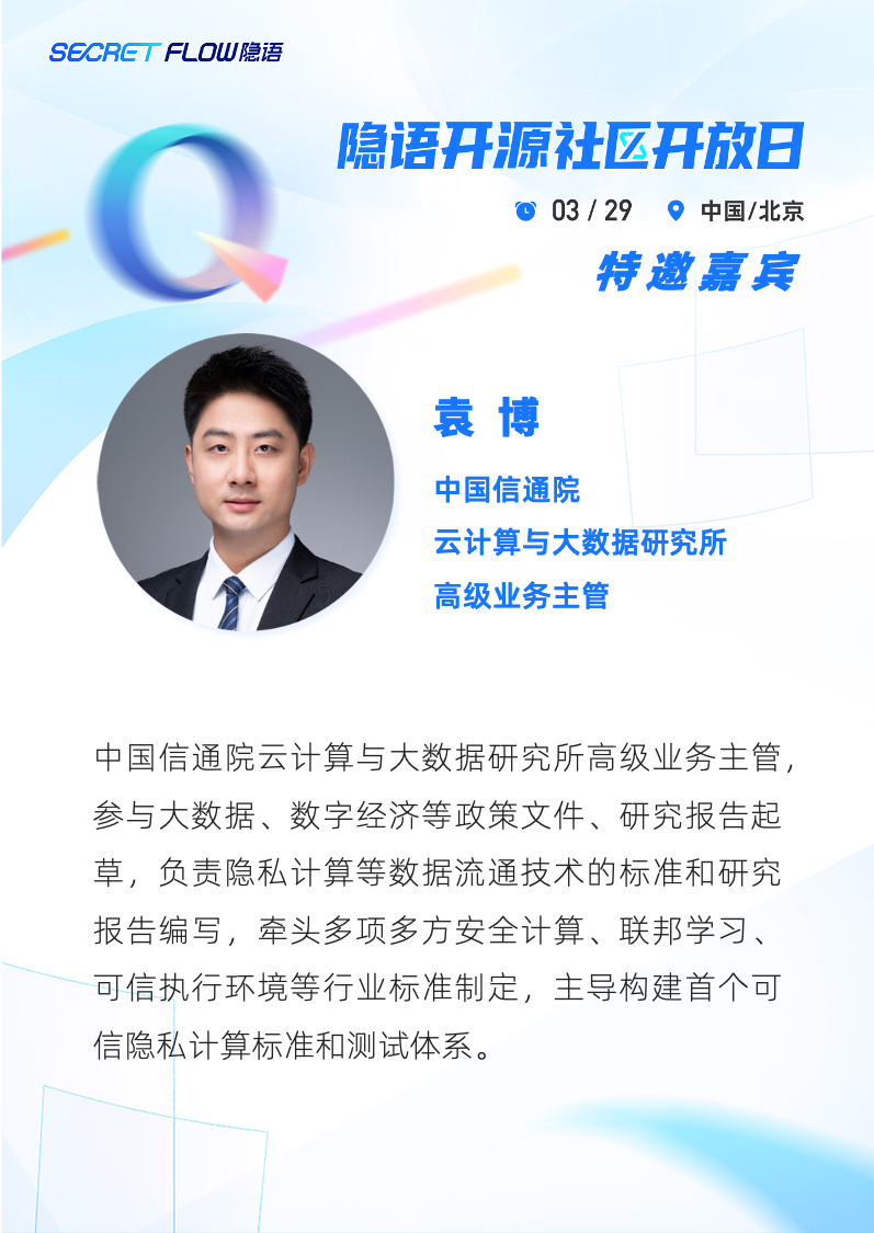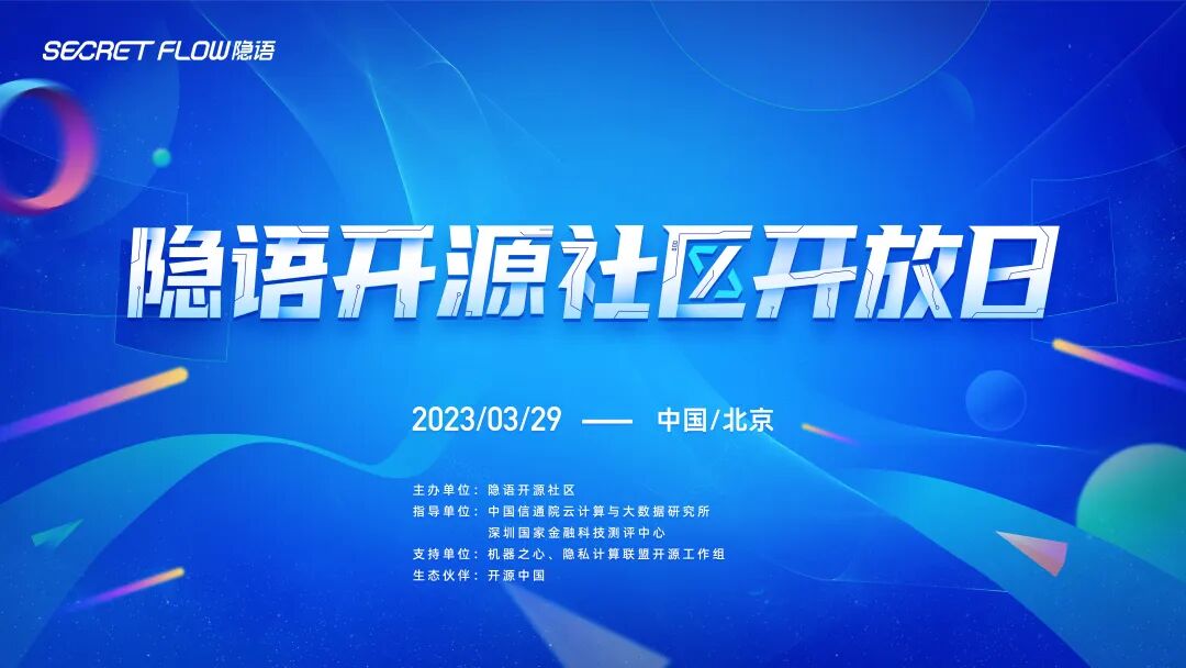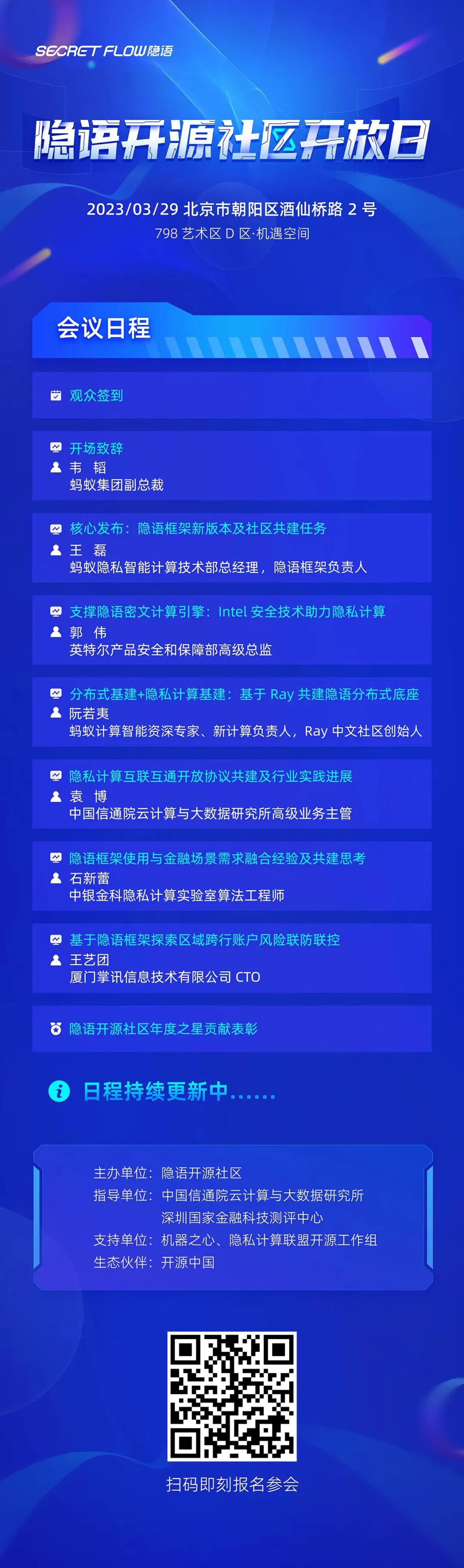 2023 年 3 月 29 日,隐语开源社区将携手中国信通院云计算与大数据研究所、深圳国家金融科技测评中心、机器之心、隐私计算联盟开源工作组和开源中国共同举办「2023 隐语开源社区开放日」,邀请隐私计算各界代表齐聚北京·798 机遇空间,与隐私计算技术开发者、产业用户,共话技术现状、共探未来趋势、共促生态连通。