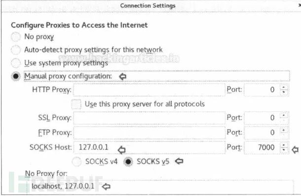 在服务器上执行以上命令,建立一个动态的SOCKS 4/5代理通道,接下来,在本地打开浏览器,设置网络代理