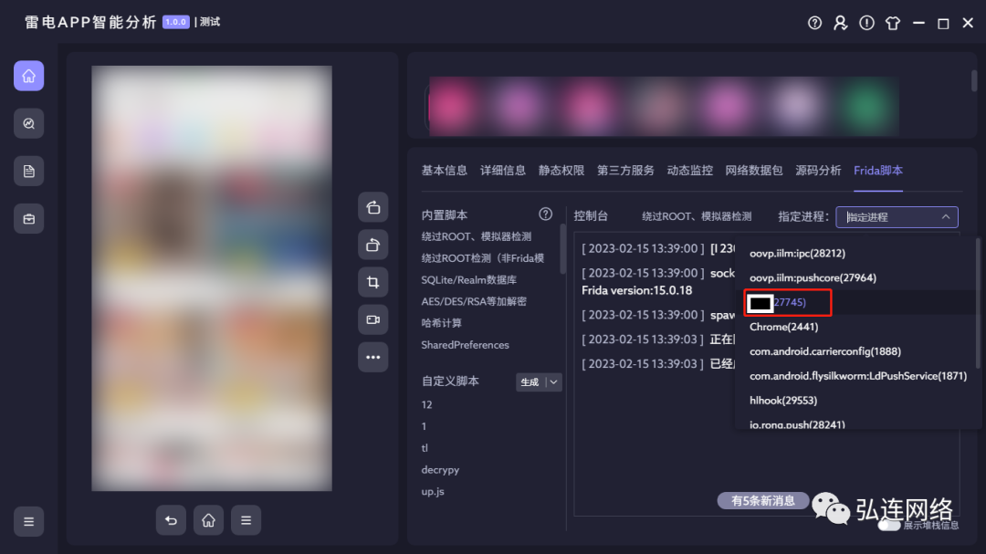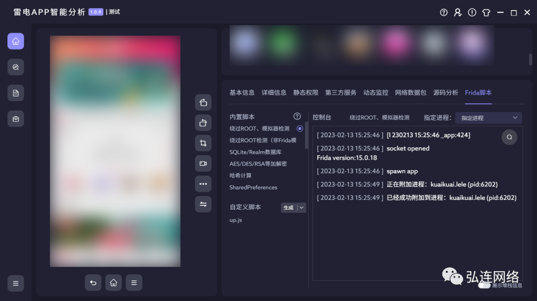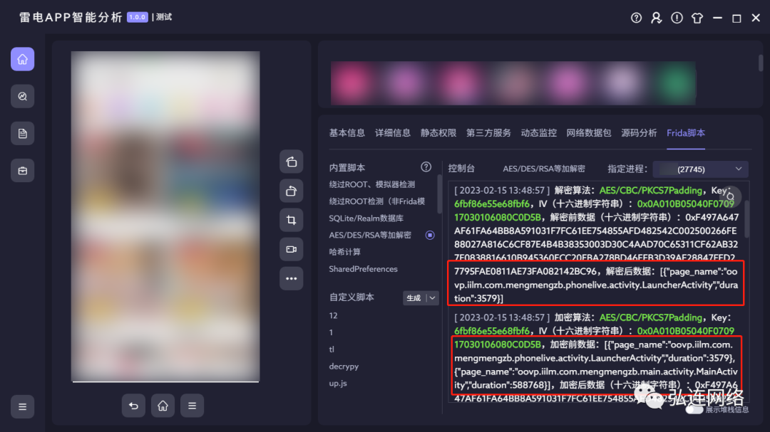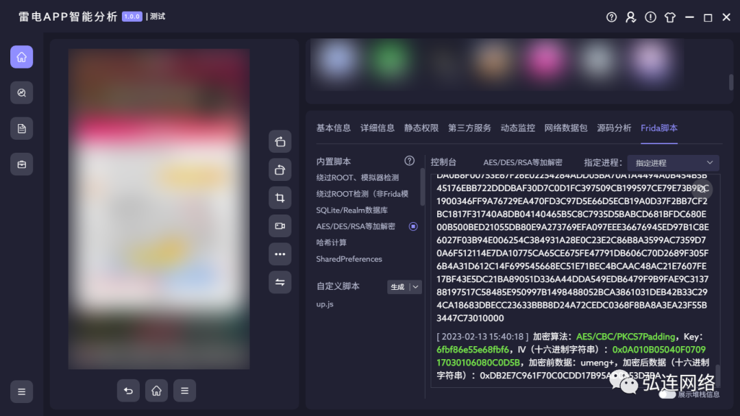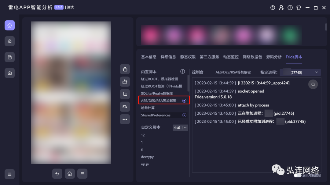 步骤2:使用雷电APP智能分析启动APP后,关闭绕过ROOT脚本,指定该APP进程,通过attach方式启动 AES/DES/RSA等加解密脚本;