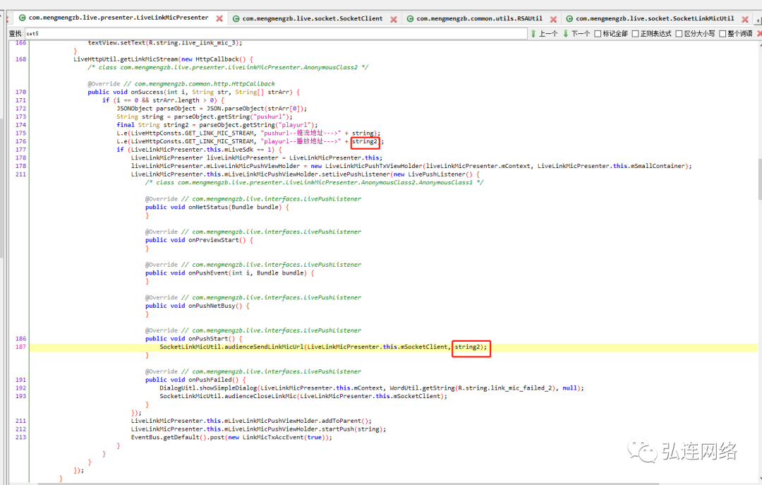 步骤10:跟进decrypt API,发现其为加解密工具类,尝试使用自动生成脚本HOOK此类,发现有解密后RTMP协议地址,猜测应该为直播源地址;