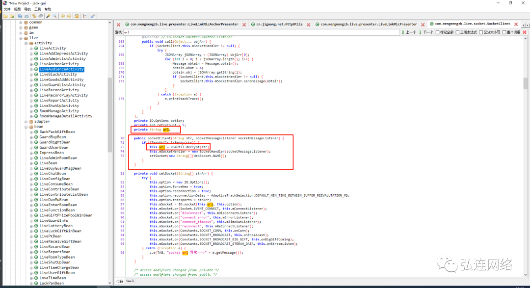 步骤4:上述可见打开直播间之后通过加解密手段获取了上述类名,除此之外无其他信息,结合类名猜测可能通过调用上述类对象完成直播间请求操作,故尝试HOOK下述筛选出来的Java类;