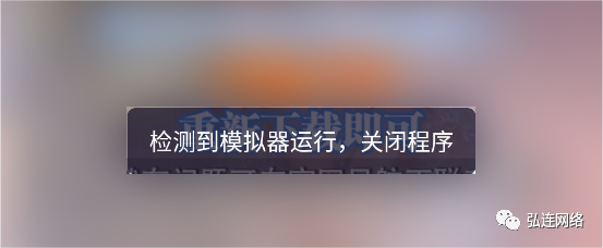 步骤1:模拟器安装启动该APP,发现提示“检测到模拟器运行,软件关闭”,故使用雷电APP智能分析打开软件绕过检测;