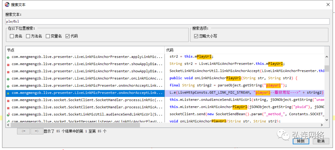 步骤7:在jadx中开启全局搜索,搜索playUrl关键字,经筛选,发现疑似播放地址请求相关代码;