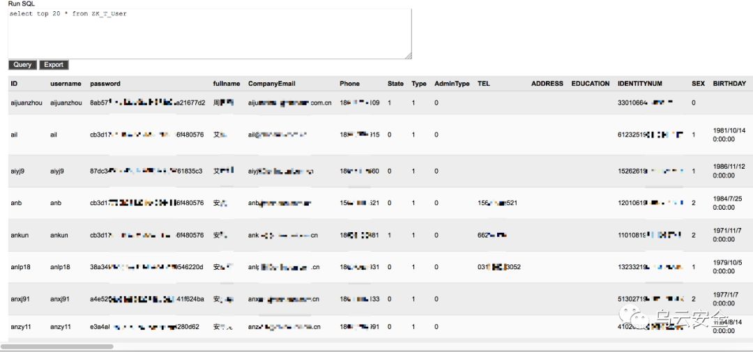 找到了用户表,有用户名、密码、姓名、手机号、邮箱、身份证号