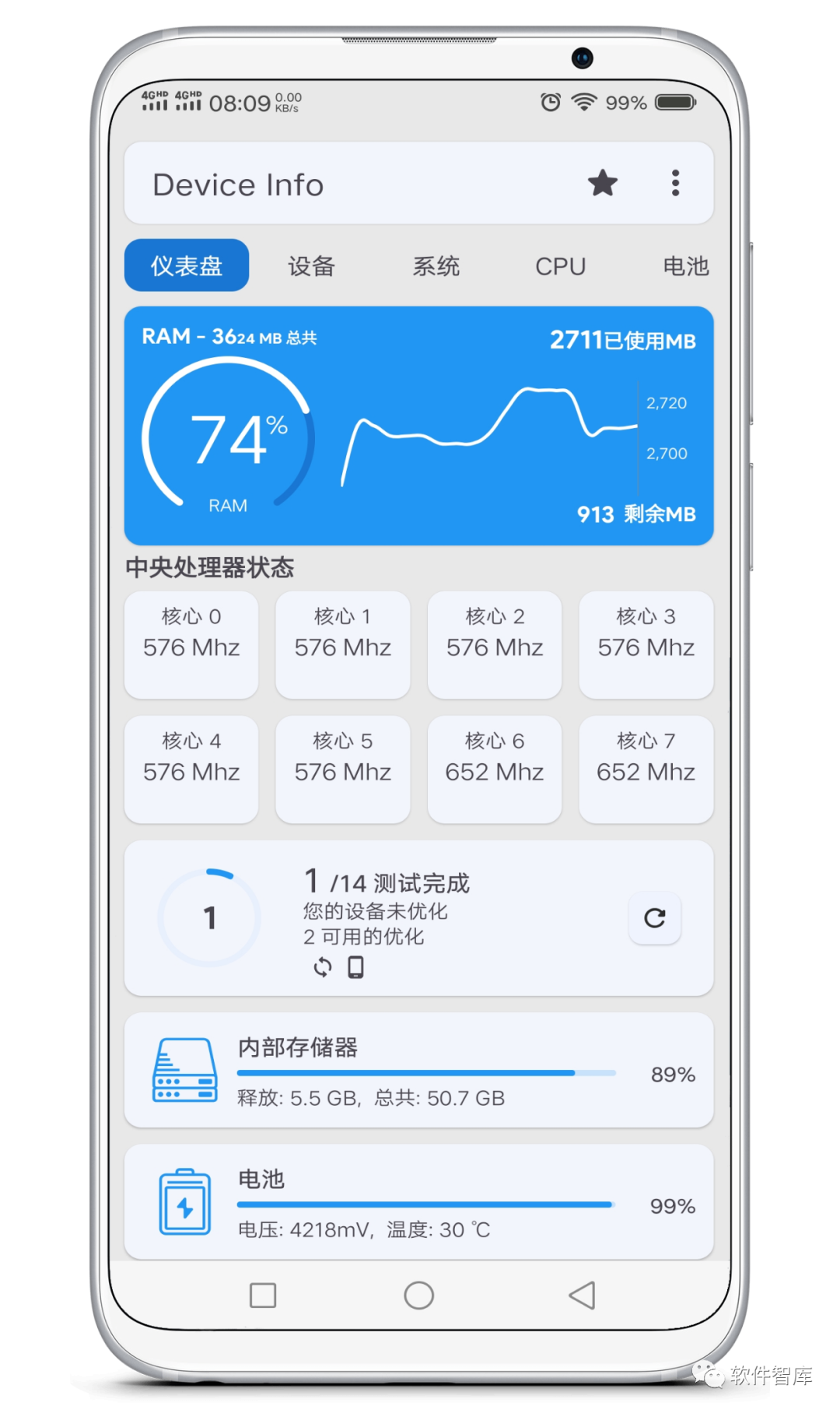 今天小库给大家分享一款能够帮助大家快速了解自己手机的工具,功能强大,不用自己繁琐的设置,安装好自动识别硬件信息。比如品牌,CPU状态,有多少传感器,还有你手机用的是什么系统,你的手机芯片有多少个核心数,以及电池,屏幕,摄像头,传感器等,总而言之,就是你手机的硬件信息这里都可以清晰看到,让你能够真正的了解你的手机;
