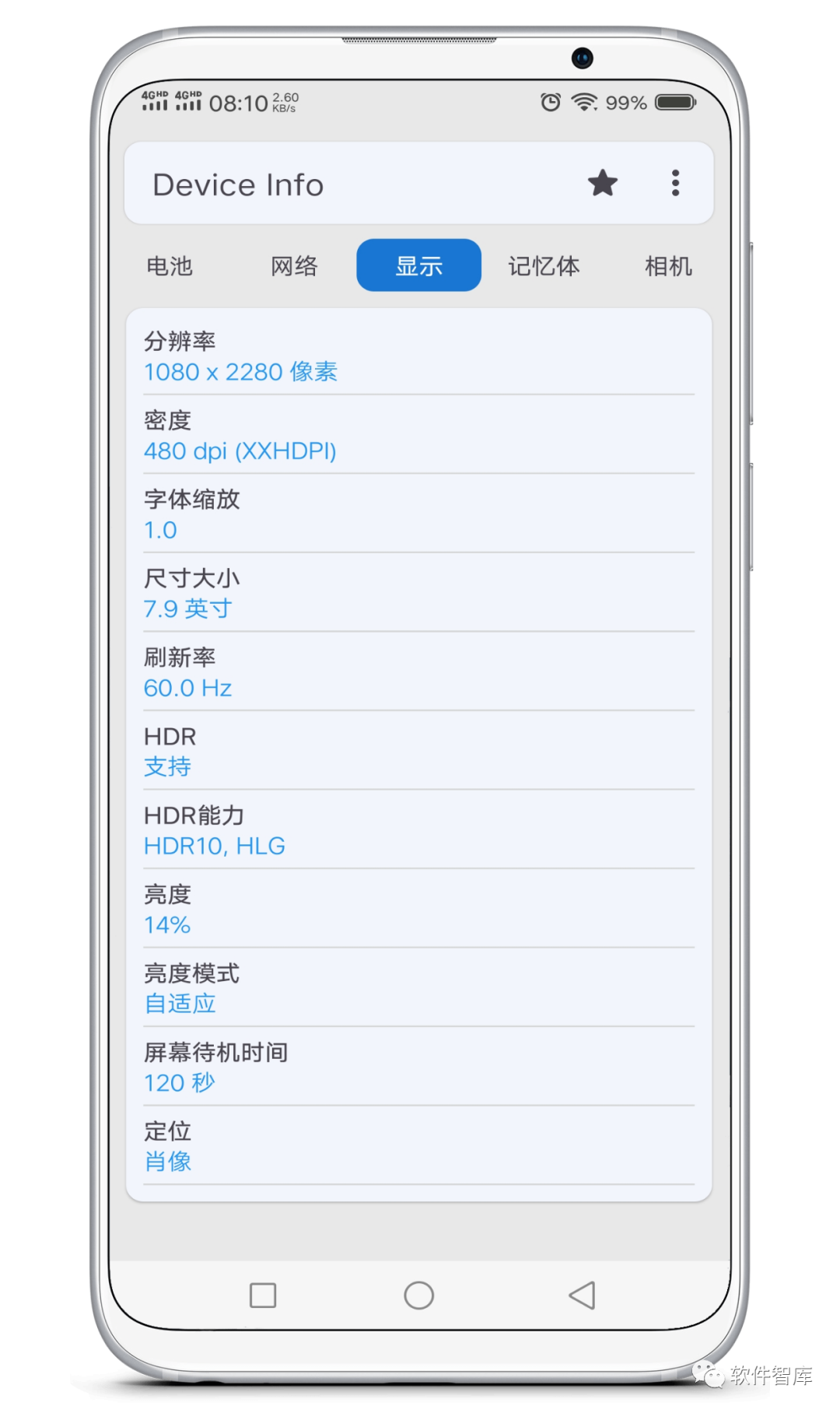 每项菜单栏下显示的硬件信息都非常详细,如屏幕:分辨率、屏幕密度、屏幕大小、刷新率等;