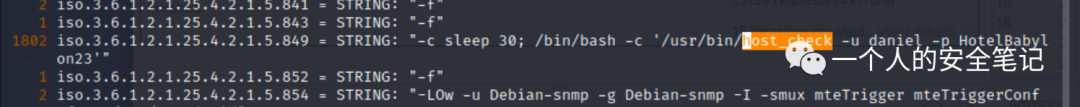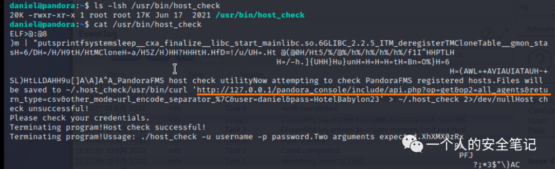 从结果中可以获悉到目标服务器更详细的内容,如 Ubuntu 版本信息、内核版本、网卡地址等等。在其中的进程信息段中,我们发现存在一个 /use/bin/host_check 命令其参数与 ssh 命令的账号密码类似。